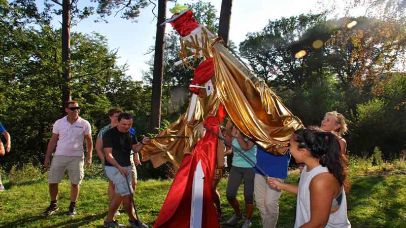 Insuffler la vie et une âme dans tout un tas d'objets inanimés est impossible ou ça l'est? «Puppet Masters» propose une activité pleine de plaisir tout en mettant à l'épreuve les équipes à composer et structurer intelligemment un projet en étapes réalisables. Avez-vous déjà réfléchi à combien d'actions individuelles nous coûtent-ils pour pouvoir marcher? En réalité cela exige de nous une coordination extrême lorsque nous passons notre poids d'une jambe à l'autre, faisant ainsi rentré en action les hanches, les abdominaux, la taille et le dos pour maintenir l'équilibre. Vous avez sûrement déjà vu ces marionnettes de 10 mètres en marge des matchs de football et en défilant durant les Jeux olympiques? «Puppet Masters» est donc l'occasion d'expérimenter les efforts de créativité et d'empathie nécessaires pour faire que ces géants paraissent humains.