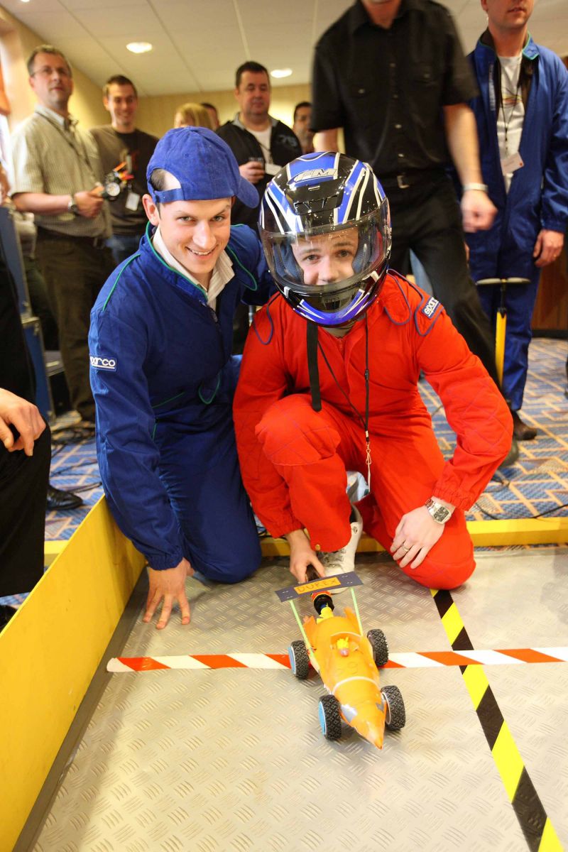 Les équipes conçoivent et construisent leurs voitures en participant à une série de défis d’équipe. Elles décorent, par la suite, des bannières et créent du matériel publicitaire pour soutenir leur équipe. Quand le moment de faire la course est venu, les mécaniciens de chaque équipe pompent de l’air dans la fusée, forçant la voiture hors de la grille de départ. Elle devra atterrir le plus proche de la ligne d’arrivée.